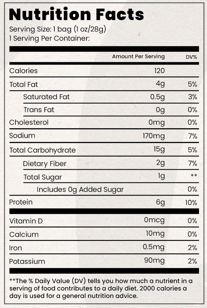 NUTRITIONServings Per Container(28g) Amount per serving Calories110 Total Fat 3g 4%Saturated Fat 0g 0% Trans Fat 0g Cholesterol 0mg 0% Sodium 210mg 9% Total Carbohydrate 14g 5% Dietary Fiber 4g14% Total Sugar 1g Includes 0g Added Sugars 0% Protein 7g 10% |